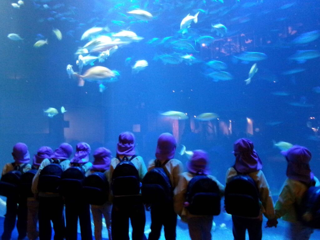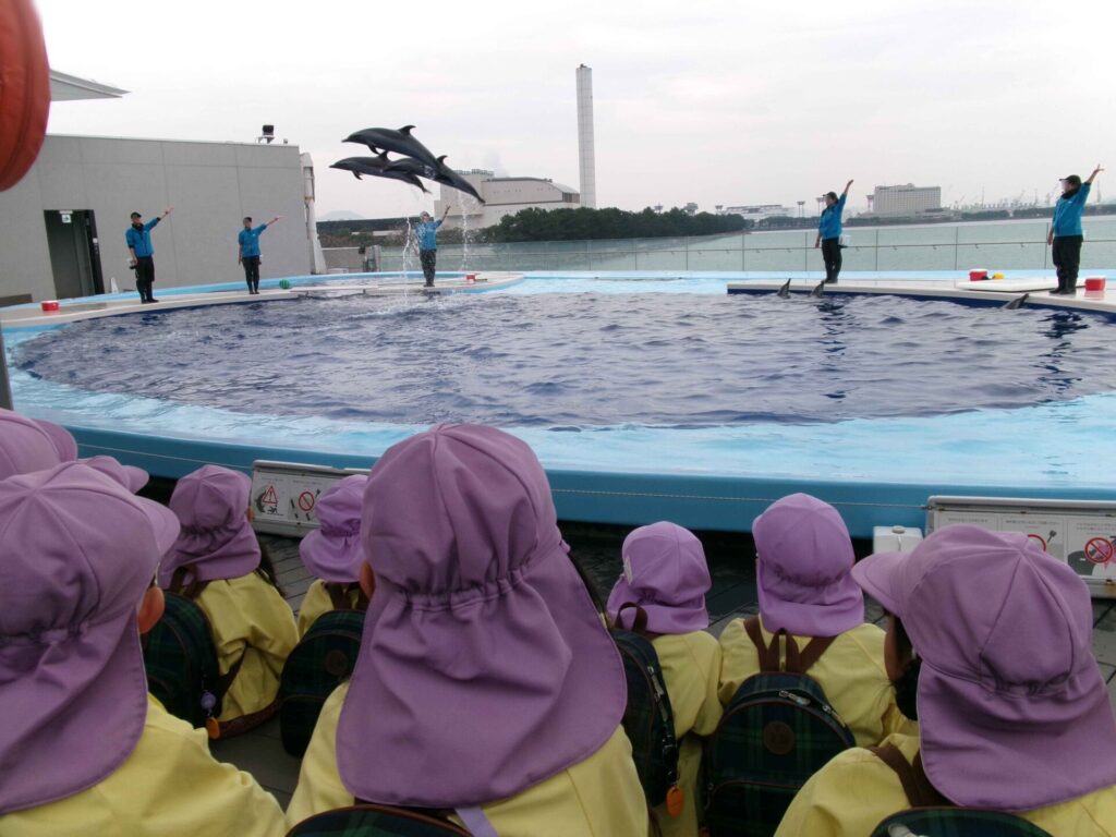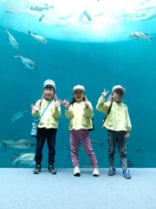 怪しい雲行きも何のその子どもたちのパワーで雲を吹き飛ばし、イルカショーやたくさんの魚に目を輝かせ友達とはしゃぎ合い思い出の一日になりました。